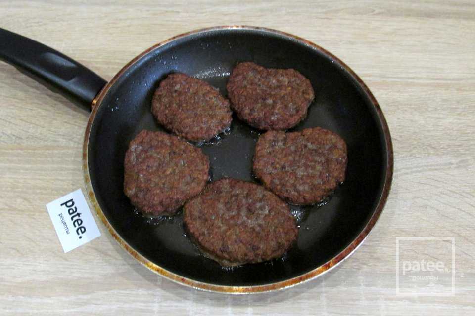 Хорошо разогреваем сковороду с маслом, столовой ложкой выкладываем наш фарш и жарим секунд по 30 с каждой стороны.