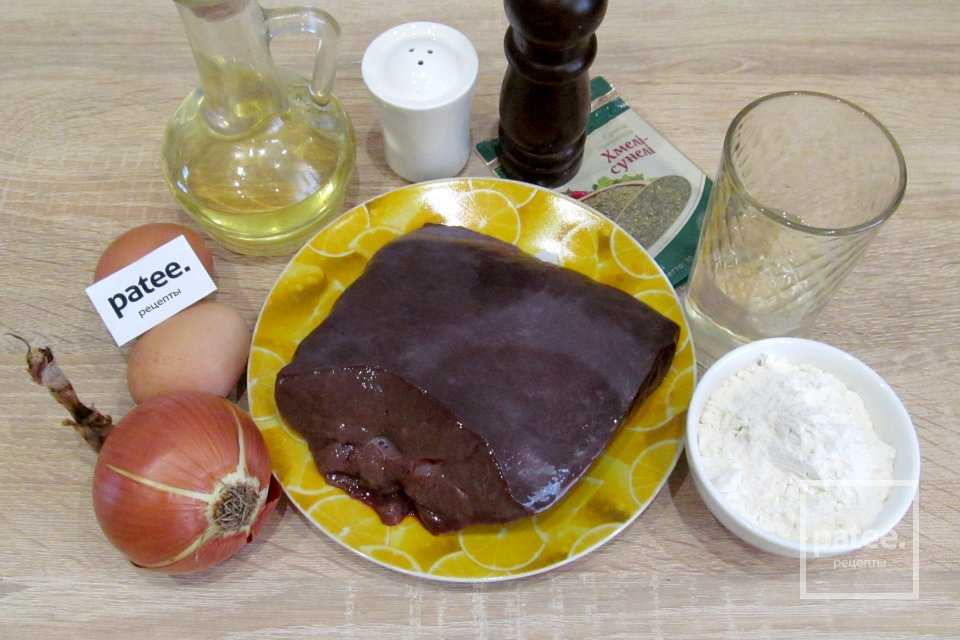 Для приготовления вкусных печеночных котлет нам понадобятся следующие ингредиенты: печень говяжья, репчатый лук, куриные яйца, пшеничная мука, вода, приправа хмели-сунели, масло подсолнечное рафинированное, соль, чёрный молотый перец.