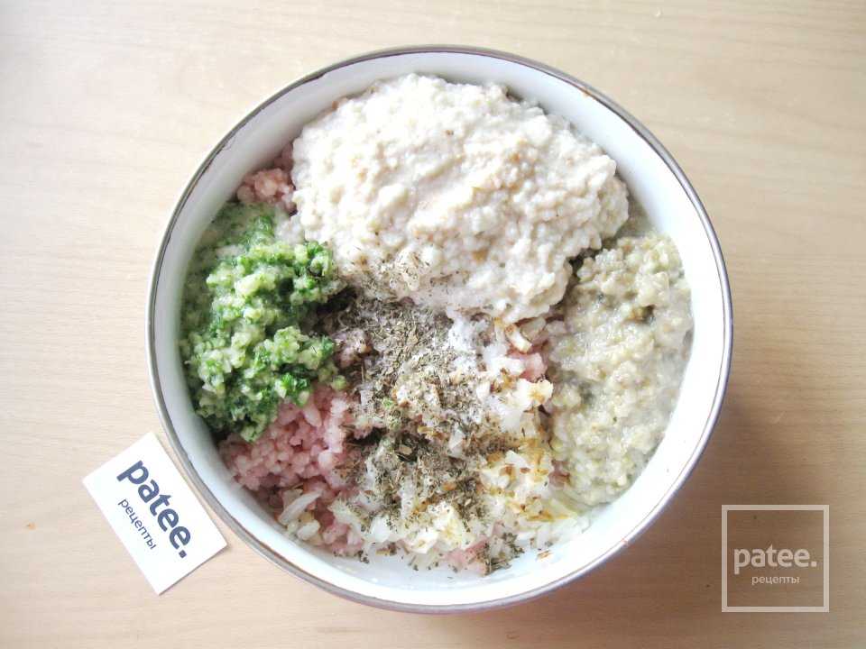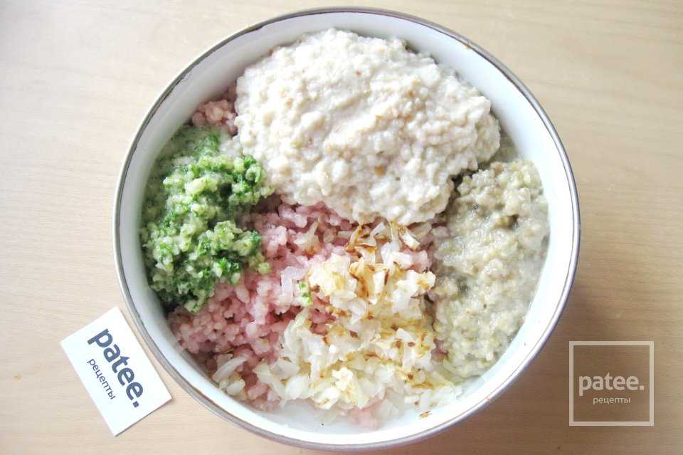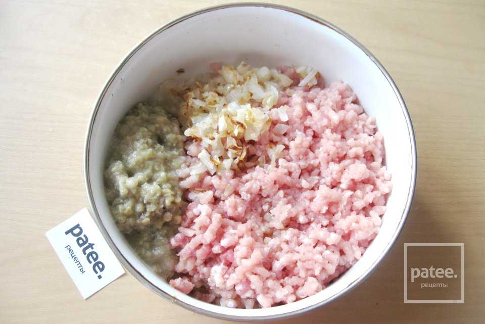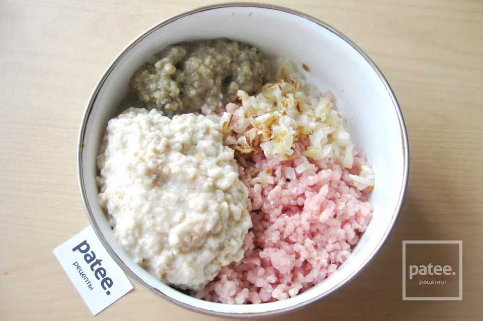 - Переложить к перекрученному мясу половину баклажанов, размешать, остальную часть добавлять постепенно, фарш не должен быть жидким. Если все же масса получилась жидковатой, то в неё придется всыпать немного молотых сухарей и подождать, пока они заберут лишнюю жидкость.