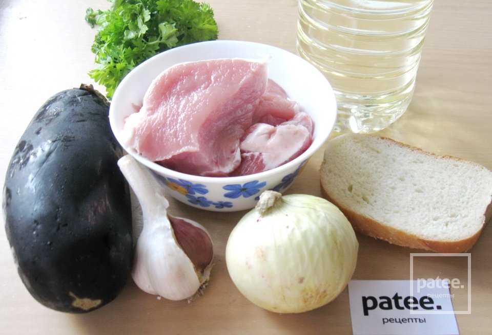 Белый батон замочить в холодной воде и через несколько минут отжать. Пропустить через мясорубку. Выложить в миску со свиным фаршем, жареным луком и баклажаном.