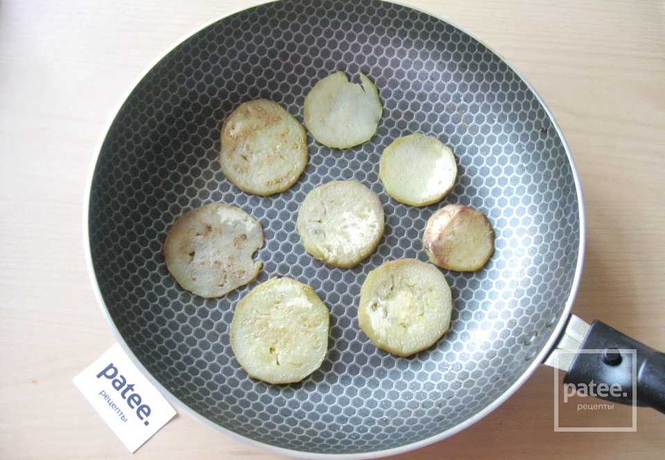 Говяжий язык отварить в подсоленной воде, охладить. Баклажаны и кабачки вымыть, обсушить, порезать тонкими пластинками и обжарить в разогретом растительном масле до золотистой корочки. Чтобы блюдо не получилось слишком жирным, масла кладут немного. Выложить овощи на тарелку, застеленную бумажным полотенцем, оно впитает лишний жир.