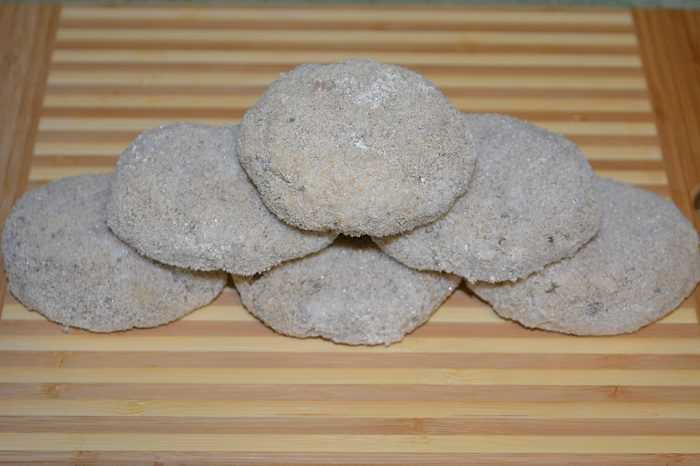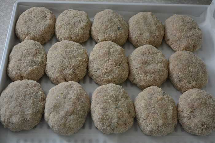 - Сформировать небольшие котлеты, обвалять их в панировочных сухарях. Для лучшей лепки руки можно смочить холодной водой.