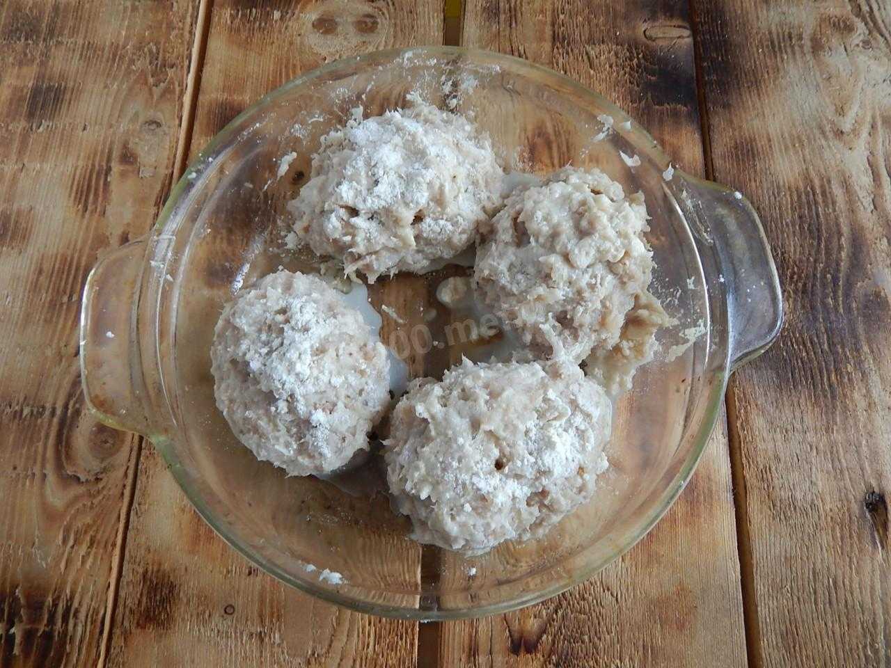 - В это время займитесь фаршем. Наберите в мисочку холодной (можно чуть тёплой) воды, чтобы постоянно смачивать ладошки, а рядом поставьте мелкую тарелку с панировкой.