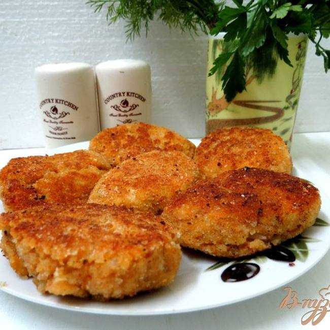 - Руками сформировать котлетки, обвалять в панировке, обжарить на растительном масле с каждой стороны. Подавать с овощным салатом, гречневой кашей или картошкой пюре.