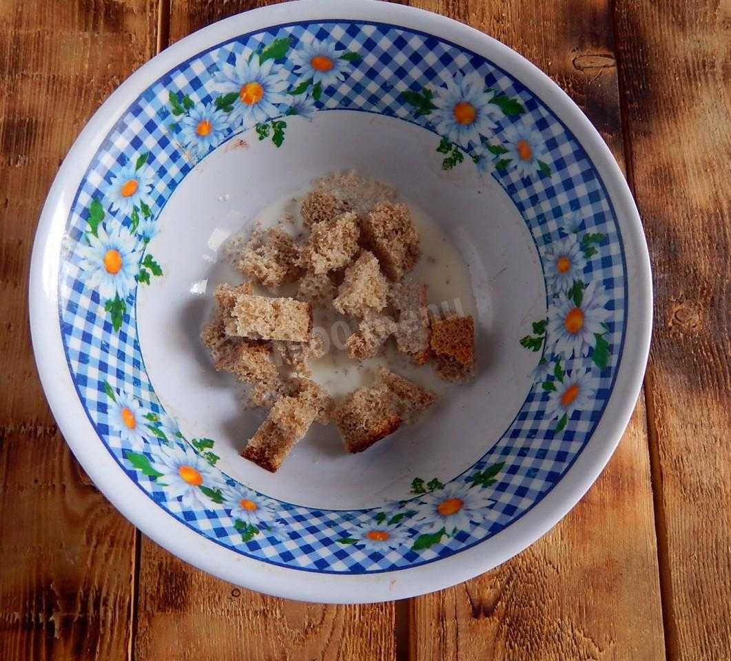 - Залить чёрный хлеб тёплой водой, чтобы размочить его. Оставить на 2–3 минуты.