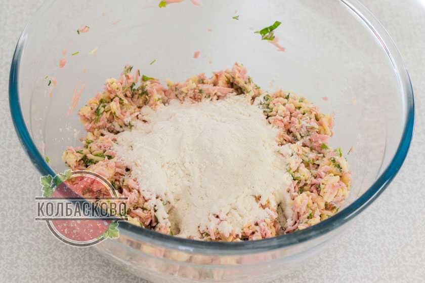5. Тщательно перемешиваем все ингредиенты до однородной массы. Добавляем пшеничную муку.
