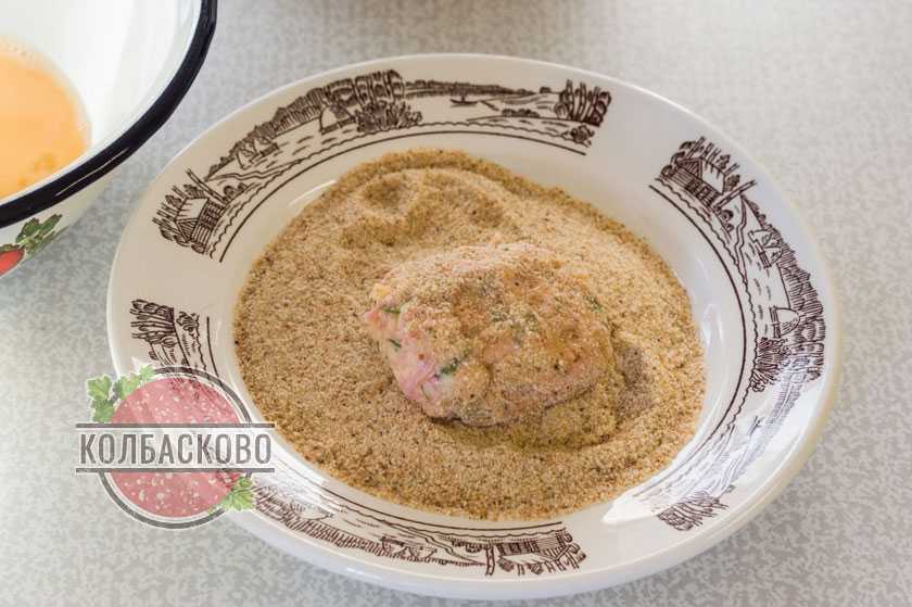 9. На плоскую тарелку высыпаем панировочные сухари. Вынимаем заготовку котлеты из яйца и обваливаем в сухарях тоже со всех сторон. Вместо покупных панировочных сухарей можно использовать домашние, приготовленные из белого хлеба в духовке. А можно и вовсе заменить сухари мукой. Кстати, очень инстересный вкус получается, когда котлеты обваливаются в муке, измельченной в кофемолке из овсяных хлопьев.
