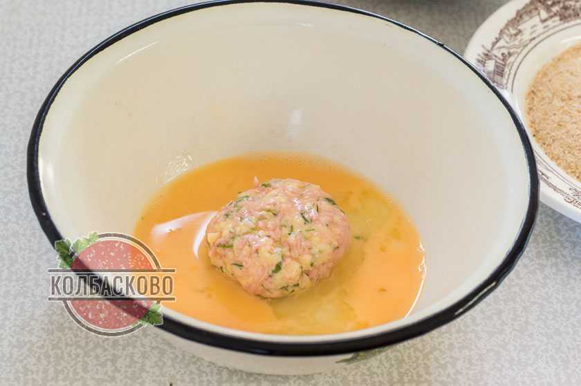 8. Из вымешанного фарша формируем котлеты небольшого размера (крупные лучше не делать, так как при переворачивании они с большой долей вероятности сломаются и потеряют презентабельный вид). Если лепить трудно, можно смочить руки холодной водой, но чаще всего это не требуется. Сформированную котлету отправляем сначала в яйцо. Окунаем так, чтобы им была смочена вся поверхность котлеты.