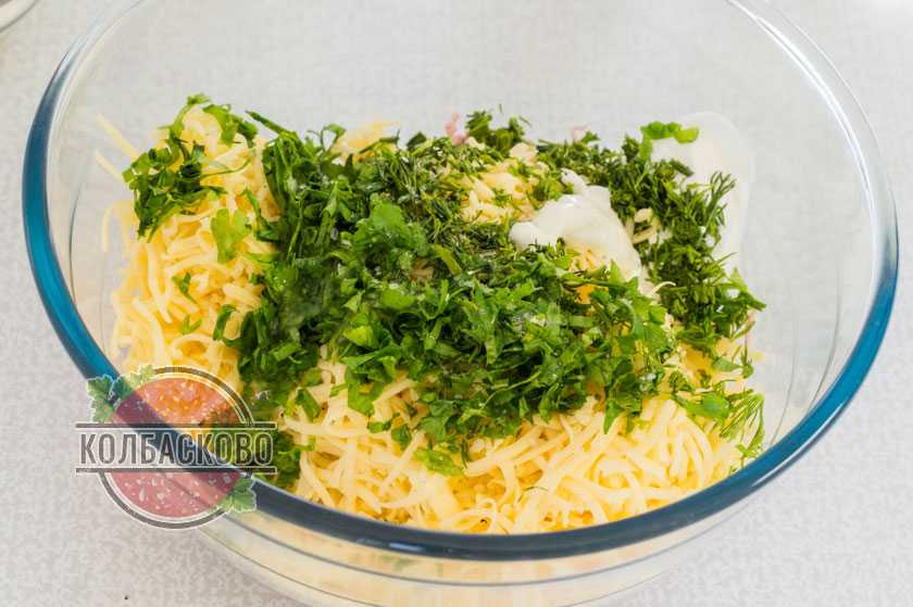 4. Соединяем в одной посуде колбасу, сыр, зелень. Туда же разбиваем одно яйцо, выкладываем сметану (самый оптимальный вариант жирности — 20%). Если сыр и колбаса не очень соленые сами по себе, добавляем щепотку соли. К фаршу можно добавить еще зубчик чеснока, чтобы было ароматнее.