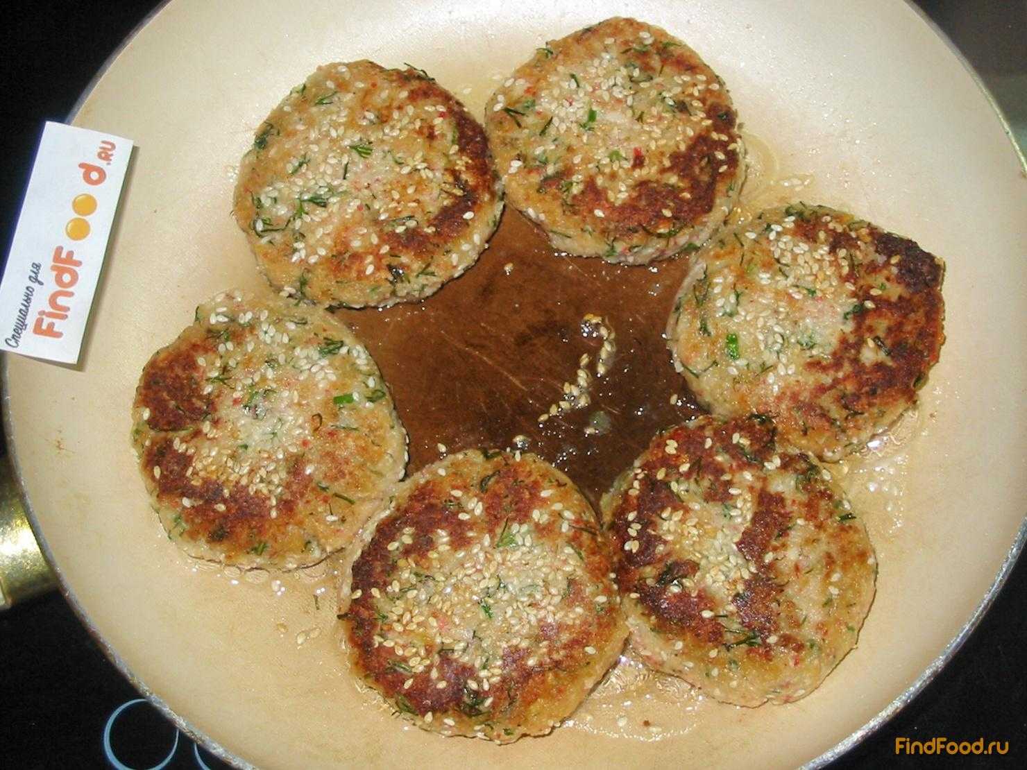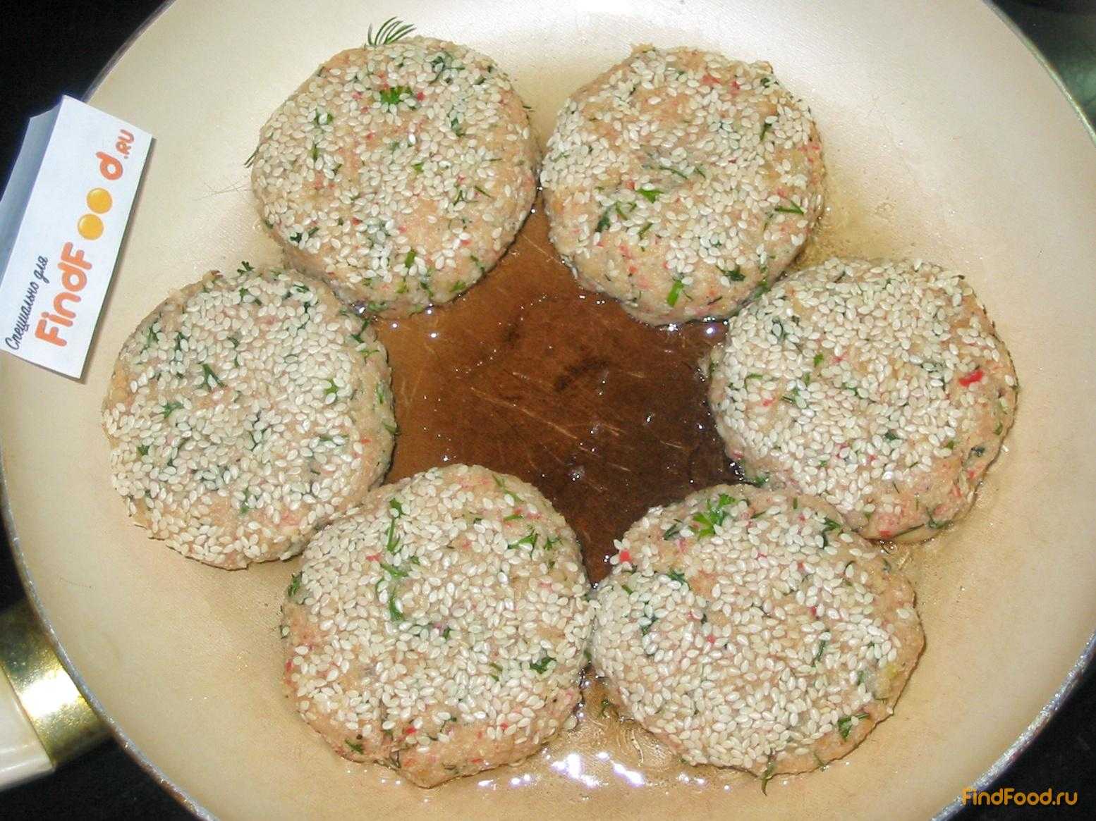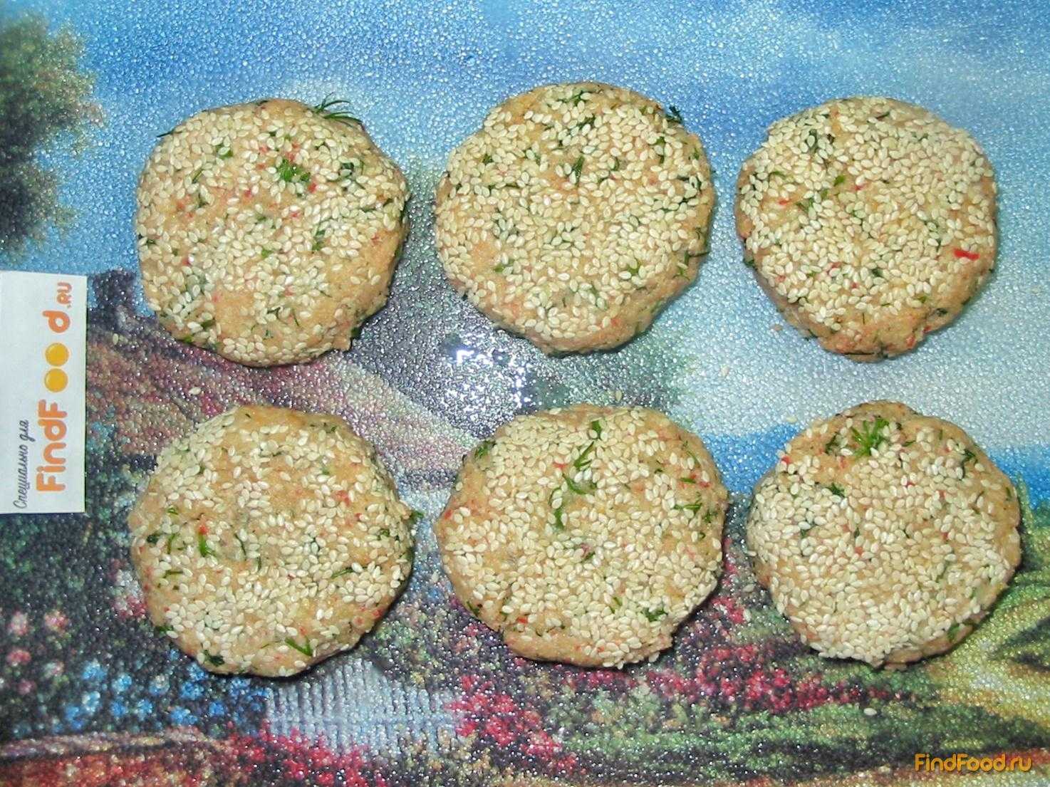 В отдельную тарелку насыпаем семена кунжута и обваливаем в них котлеты с обеих сторон. Кунжут в этом блюде выполняет роль панировки.