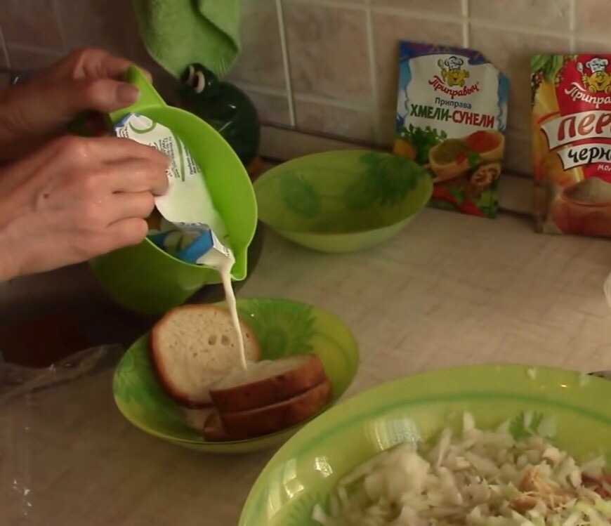 3. Берем несколько кусочков хлеба или батона, кладем в чашку и заливаем молоком, оставим на время разбухать.
