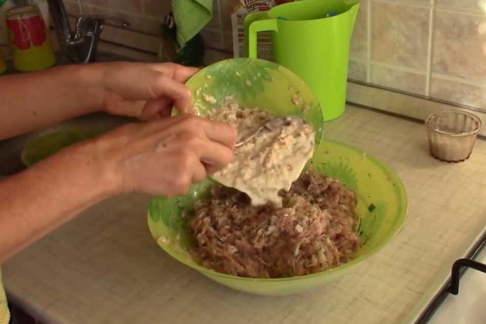 5. Хлеб разминаем с помощью рук, выливаем смесь в остальные ингредиенты, и тщательно вымешиваем фарш.