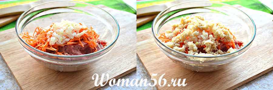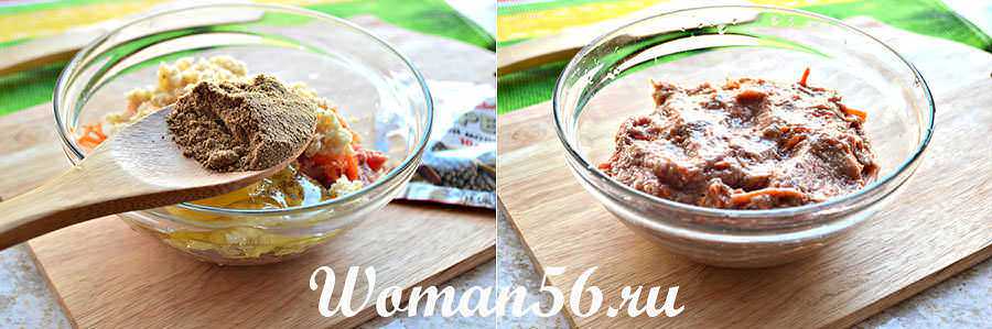 - Добавьте в фарш все остальные компоненты, кроме сыра. Смешайте, накройте пленкой и уберите на час в холодильник. Когда достанете для дальнейшей готовки, нужно будет слить появившуюся жидкость.