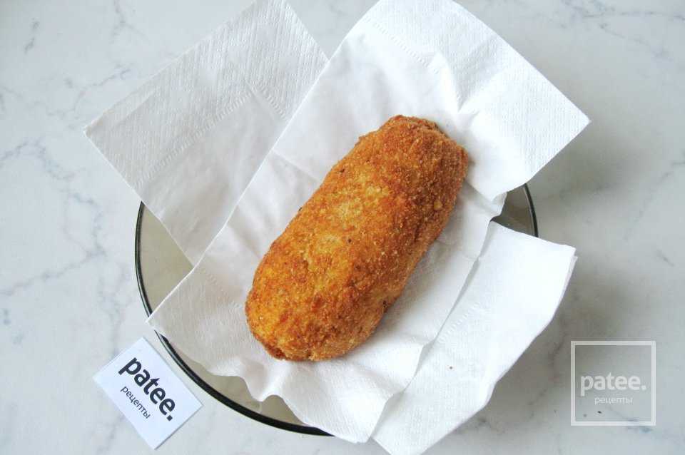 Обжарить котлету со всех сторон во фритюре до золотистой корочки. После выложить на бумажную салфетку для удаления лишнего жира. Отправить котлеты на противень и еще дополнительно прогреть их в духовке при температуре 180-185 градусов в течение 15 минут.