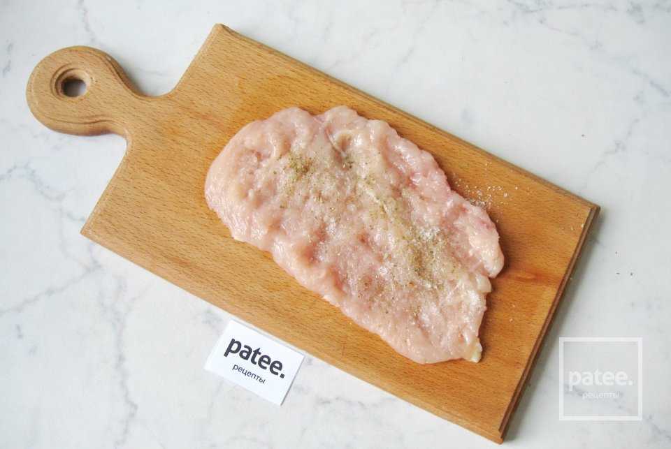 Хорошо отбить с 2-х сторон, накрыв мясо пищевой плёнкой.