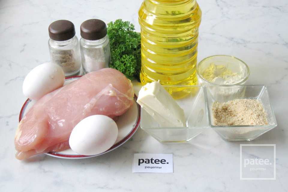Ингредиенты: куриное филе, сливочное масло, перец, сухари панировочные из белого хлеба, яйцо, мука, чеснок (2 зубчика), петрушка, укроп, базилик, растительное масло.