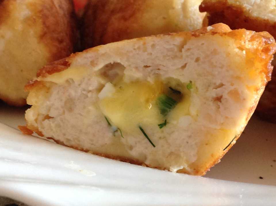 Взять столовую ложку куриного фарша, сформировать из него лепешку и положить в середину 1 ч. ложку начинки из яиц и сыра. Затем залепить фаршем начинку и сформировать котлету с начинкой внутри.