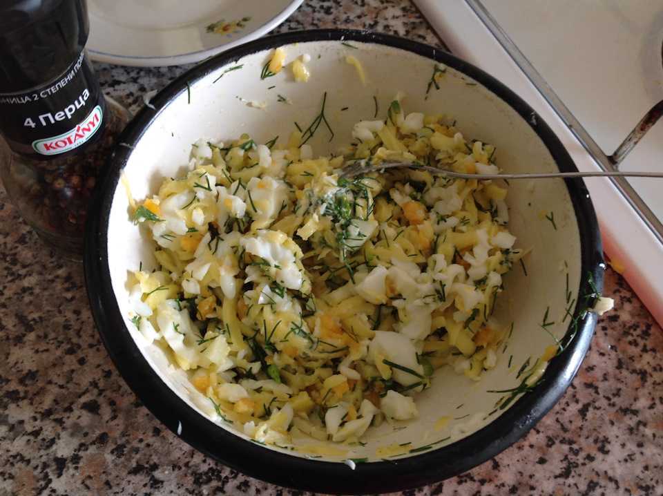 Для начинки заранее отварить 2 куриных яйца. Затем яйца и сыр натереть на мелкой терочке, зелень мелко порубить. Добавить размягченное сливочное масло, соль и перец по вкусу, тщательно перемешать.