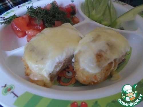 7. Выложить котлетки в форму для запекания, смазать сметаной, посыпать натертым на мелкой терке сыром. Запекать при температуре 180 градусов 20 — 25 минут.