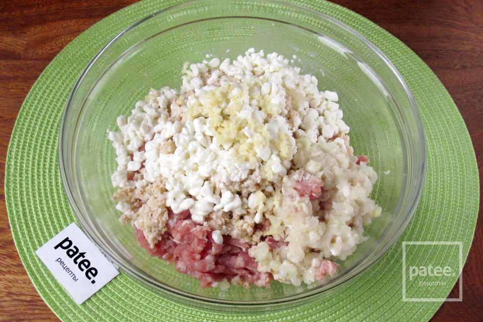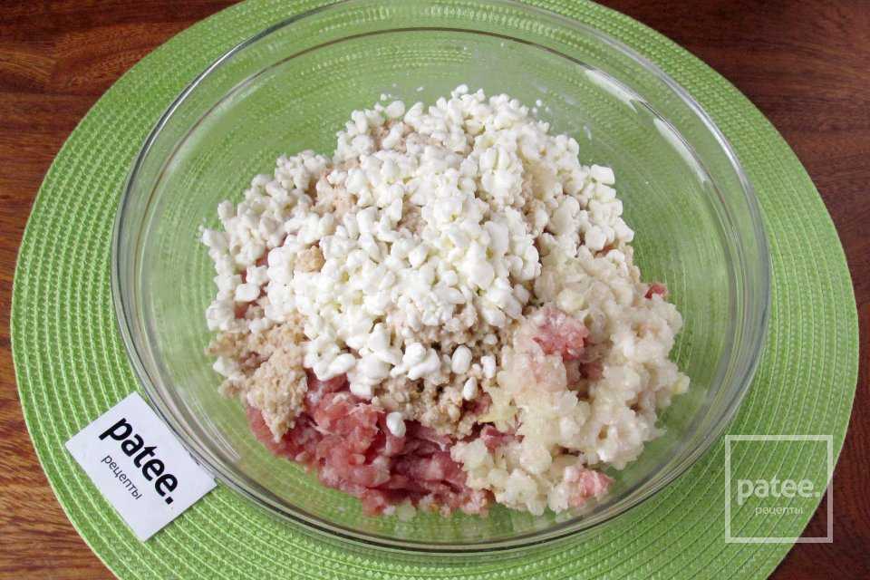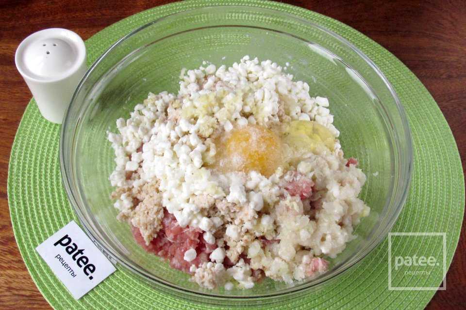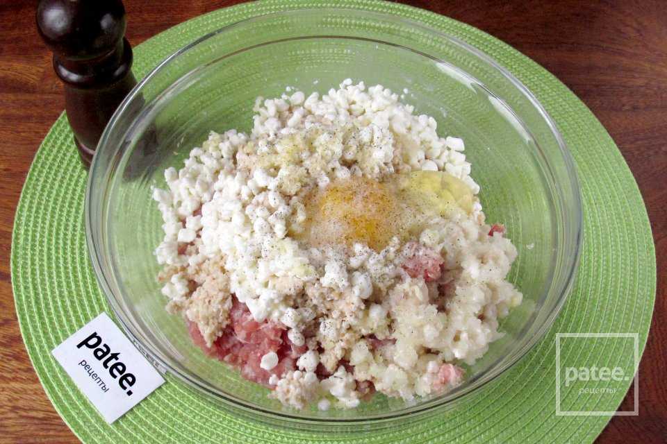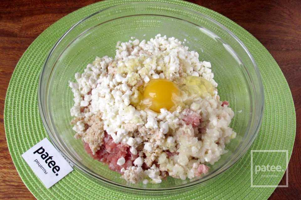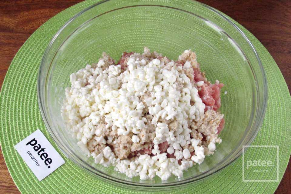 Следующим делом смешиваем все наши составляющие: творог (лучше всего подойдет именно жирный) фарш индейки, шпинат и куриные яйца. Солим, добавляем специи по вкусу и панировочные сухари.