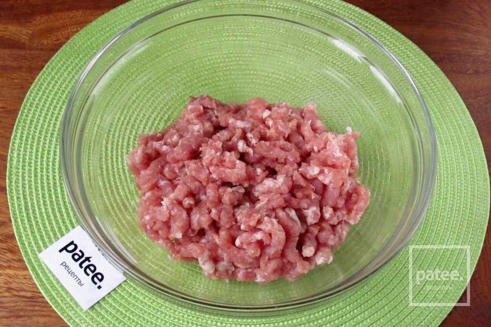 Свинину промываем и нарезаем небольшими кусочками. Пропускаем мясо через мясорубку и перекладываем полученный фарш в миску.