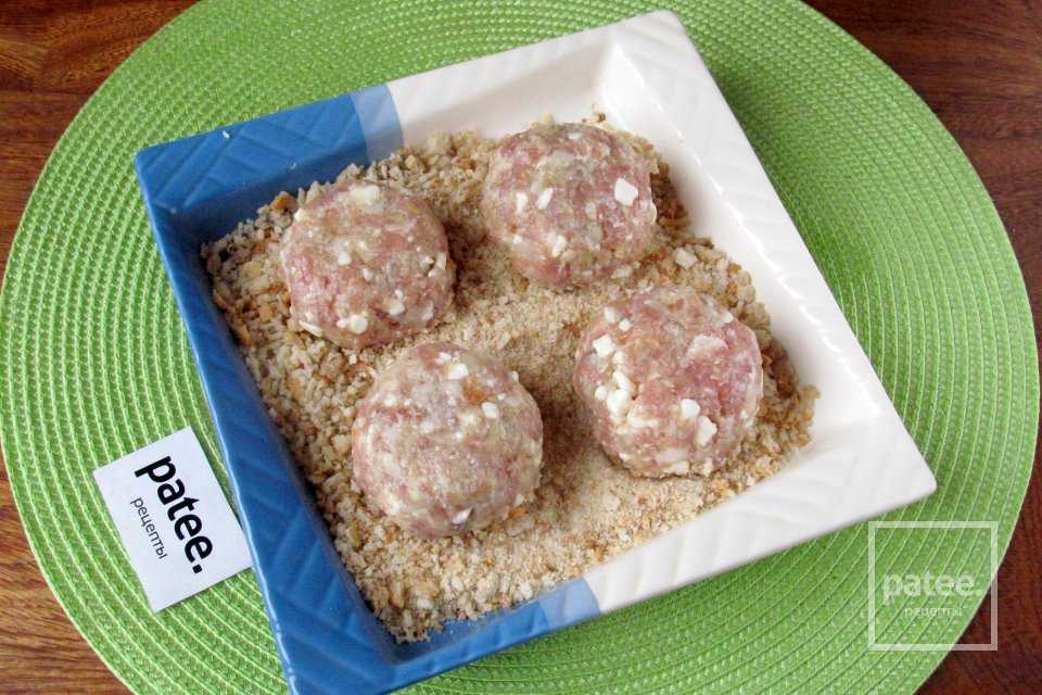 Смоченными в воде руками формируем из фарша круглые котлетки и панируем их в сухарях. Из предложенного в рецепте количества ингредиентов получится 12-14 котлет.