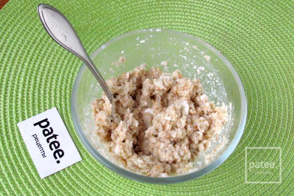 С зернёного творога сливаем сливки, в которых он находился, и заливаем ими панировочные сухари или кусочки пшеничного хлеба. Перемешиваем сухари — должна получится хлебная кашица. Если вы используете обычный творог, тогда залейте сухарики кипячёной водой или молоком.