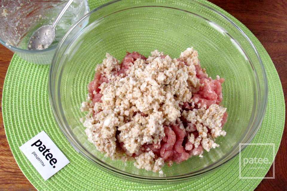 В миску с мясным фаршем перекладываем размякшие сухарики.