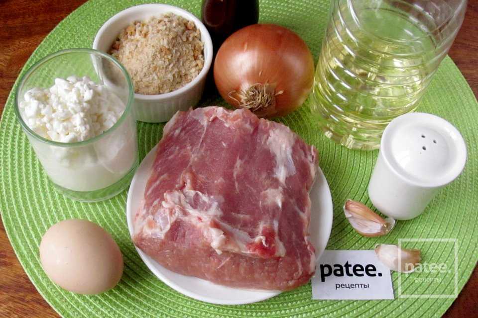 Для приготовления котлет с творогом нам понадобятся следующие ингредиенты: свинина мякоть, творог, репчатый лук, чеснок, куриное яйцо, панировочные сухари, масло подсолнечное рафинированное, соль, чёрный молотый перец, вода.