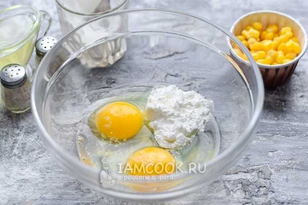 В глубокую миску вбить несколько куриных яиц, добавить кукурузный крахмал. Всыпать щепотку соли, по желанию добавить специи от себя.
