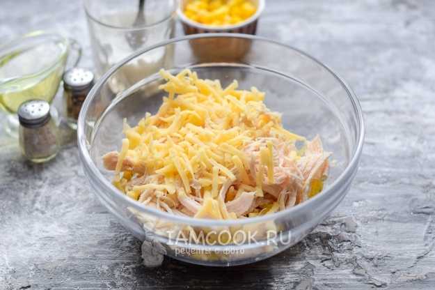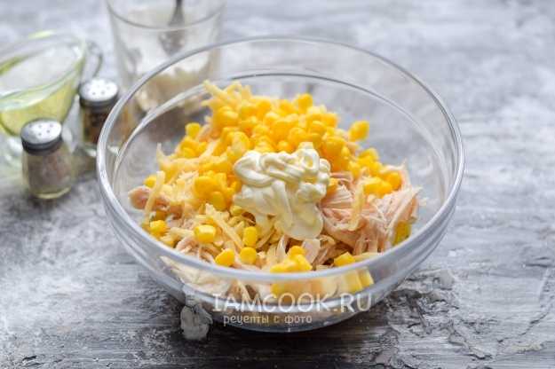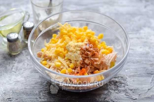 Добавить ко всем ингредиентам кукурузу и майонез.
