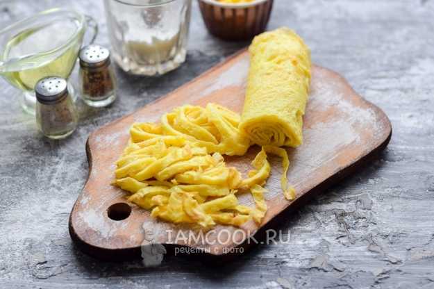 Все приготовленные блины сложить стопочкой и свернуть рулетом, после нарезать рулет тонкой полоской.