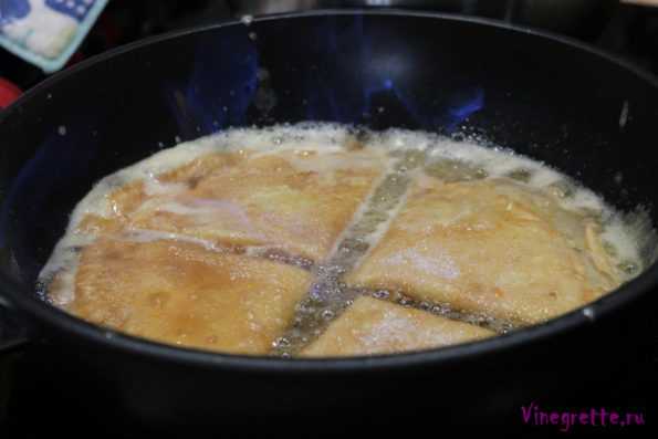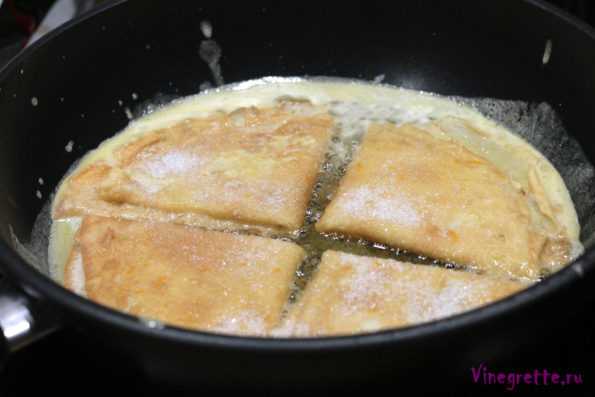 6. Перед подачей разогрейте толстостенную сковородку, положите в нее заготовленное апельсиновое масло и дождитесь, пока оно расплавится и начнет пузыриться. Возьмите блинчик, окуните в расплавленное масло со сковороды с двух сторон, сложите вчетверо и уложите в ту же сковородку. Сделайте то же самое для блинчиков, которые вы собираетесь подать.