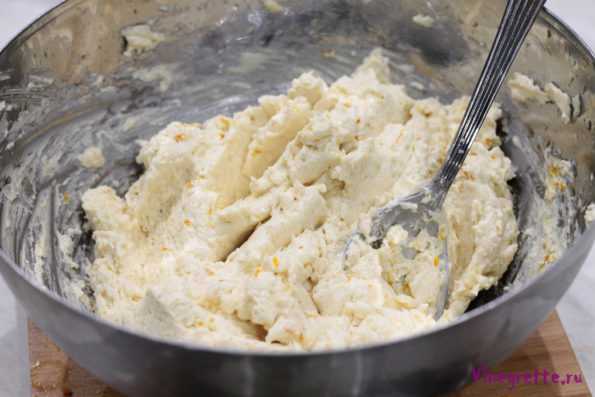 5. Добавьте размягченное сливочное масло и взбейте до консистенции крема. По чуть-чуть введите апельсиновый сок (160 мл) и ликер, чтобы получился густой крем. Накройте и охлаждайте до использования.