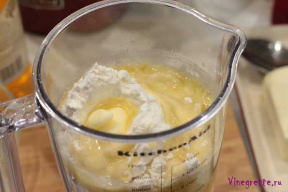 1. Начните с блинчиков. Сложите все ингредиенты для них в стакан от блендера в том порядке, как они даны в списке (масло нужно растопить и слегка остудить).