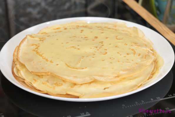 3. Хорошо разогрейте блинную сковородку, смажьте тонким слоем растительного масла с помощью кисточки. Налейте небольшой половник теста на сковородку, сразу же прокручивая ее по кругу, чтобы тесто распределилось по всей поверхности тонким слоем. Жарьте, пока тесто не схватится, а затем переверните с помощью лопатки. Подрумяньте вторую сторону в течение примерно 30 секунд и переложите готовый креп на тарелку. Повторите то же самое для всех блинчиков.
