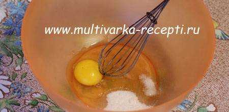 В глубокую миску вбить яйцо, добавить сахар, соль и растереть все венчиком.