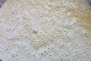 Примерно через 40 минут тесто частично поднимется, хорошенько перемешайте его и снова спрячьте кастрюлю в тепло.
