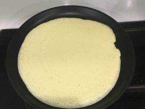 Затем круговым движением руки разворачиваем сковороду так, чтобы тесто растеклось в круглый пласт толщиной 2–3 миллиметра, и ставим ее обратно на включенную плиту. Жарим блин до того момента, пока по краям не останется жидкой массы, а кромка не приобретет бежевый оттенок.