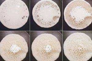 - Разогрейте на плите сковороду, смажьте растительным маслом и выпекайте блины, пока не подрумянятся с двух сторон. В результате получится целая миска пышных, перфорированных блинчиков.