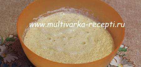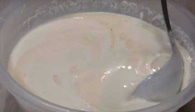 Тесто нужно хорошо перемешать. По консистенции оно напоминает жирный кефир.