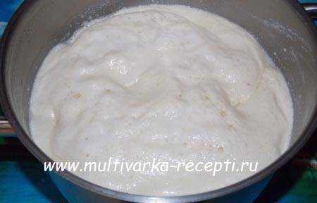 В последнюю очередь введите в жидкую массу муку, ориентируясь на желаемую густоту теста. Закройте кастрюлю с тестом крышкой и уберите в теплый уголок кухни.