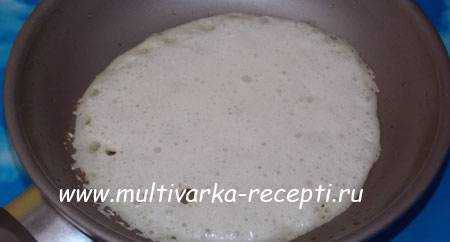 Делается припек просто. Нужно налить на сковороду тесто для блинов, пока одна сторона жарится, нужно на сырую разложить припек и перевернуть ее, чтобы она прожарилась.