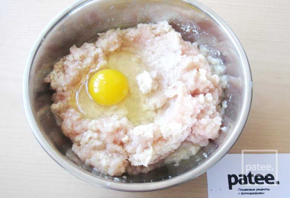 Вбить прямо в чашу куриное яйцо среднего размера. Соль и перец добавлять в фарш по своему вкусу.