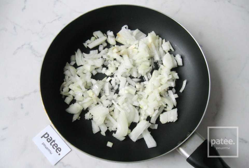 Репчатый лук почистить, помыть и мелко нарезать. На сковороду налить подсолнечное масло и выложить нарезанный лук. Поджарить лук до прозрачности, перемешивая на среднем огне.