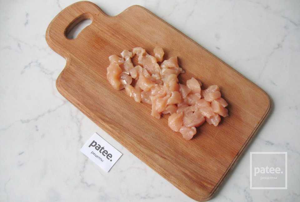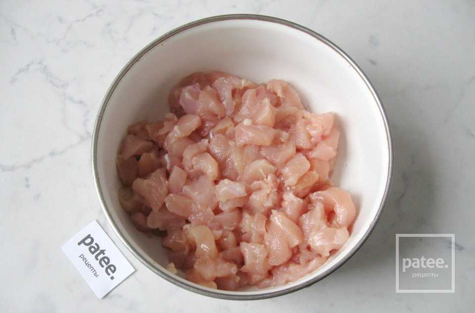 Куриное филе помыть, у меня грудка. Нарезать небольшими кусочками размером приблизительно 1,5 х 2 сантиметра.
