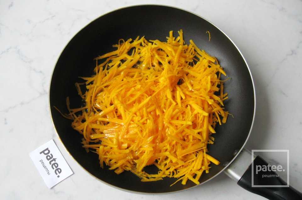 Тыкву почистить, помыть и натереть на терке. После этого выложить её на сковороду с подсолнечным маслом. Тушить 7-10 минут, периодически перемешивая.