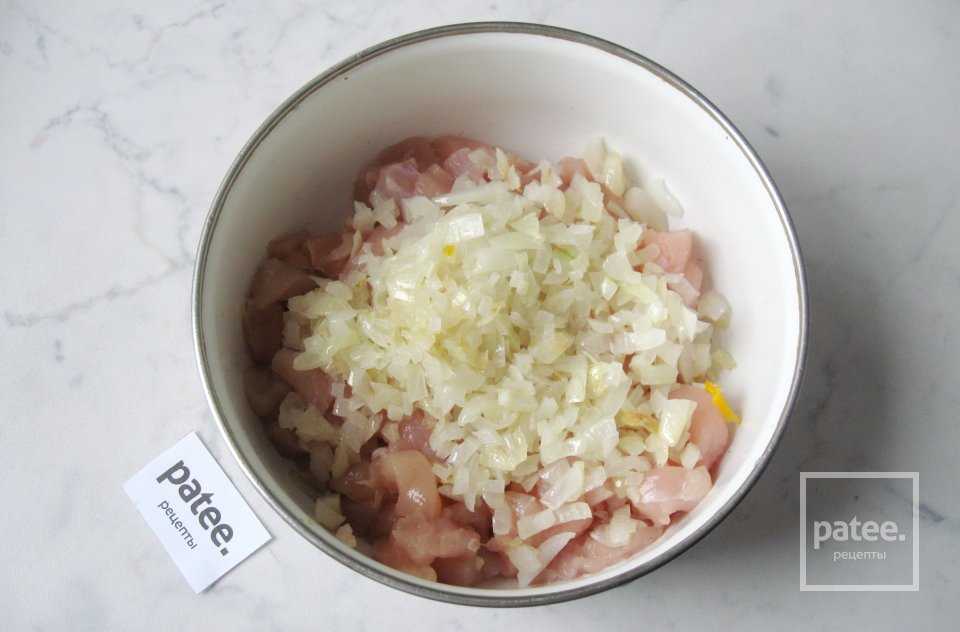 Куриную грудку зачищаем от пленок, нарезаем небольшими кусочками. Луковицу освобождаем от шелухи, разрезаем на четыре части. Пропускаем через мясорубку куриное мясо с репчатым луком.