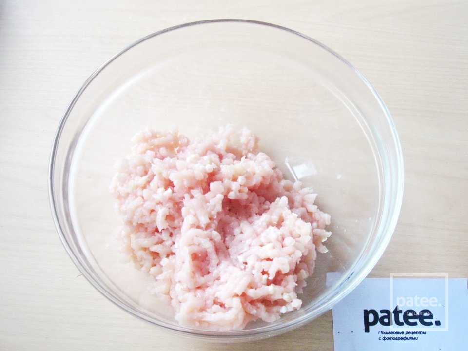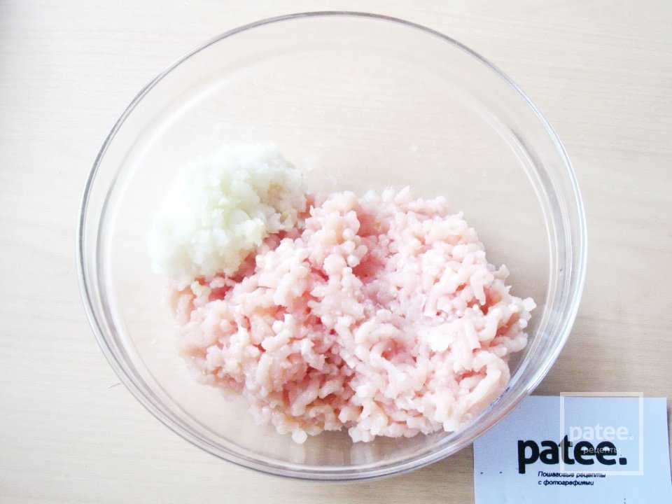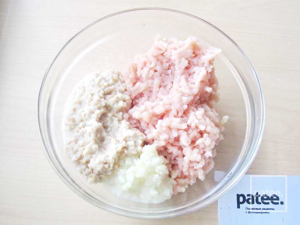 Молотую куриную грудку, репчатый лук, чеснок и белый батон солим по вкусу и тщательно перемешиваем. Можно добавить молотый черный перец и любые сухие приправы. Я добавляла только соль.