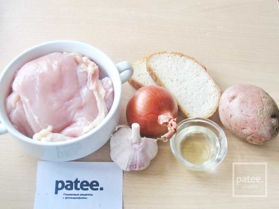 Для приготовления куриных котлет в картофельной панировке( стружке ) понадобятся такие продукты: филе куриной грудки, лук репчатый, чеснок, белый батон, картофель, масло подсолнечное, соль.